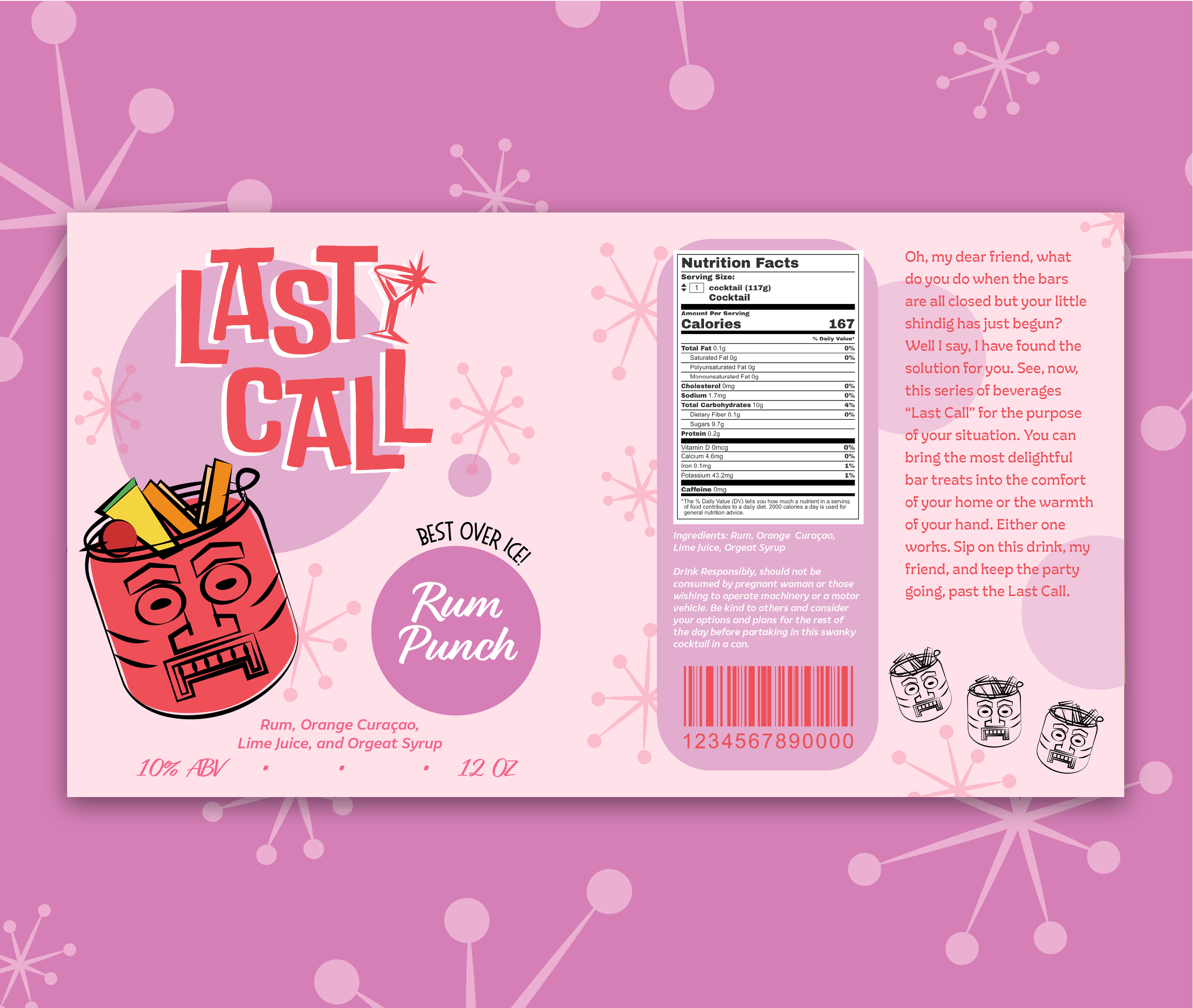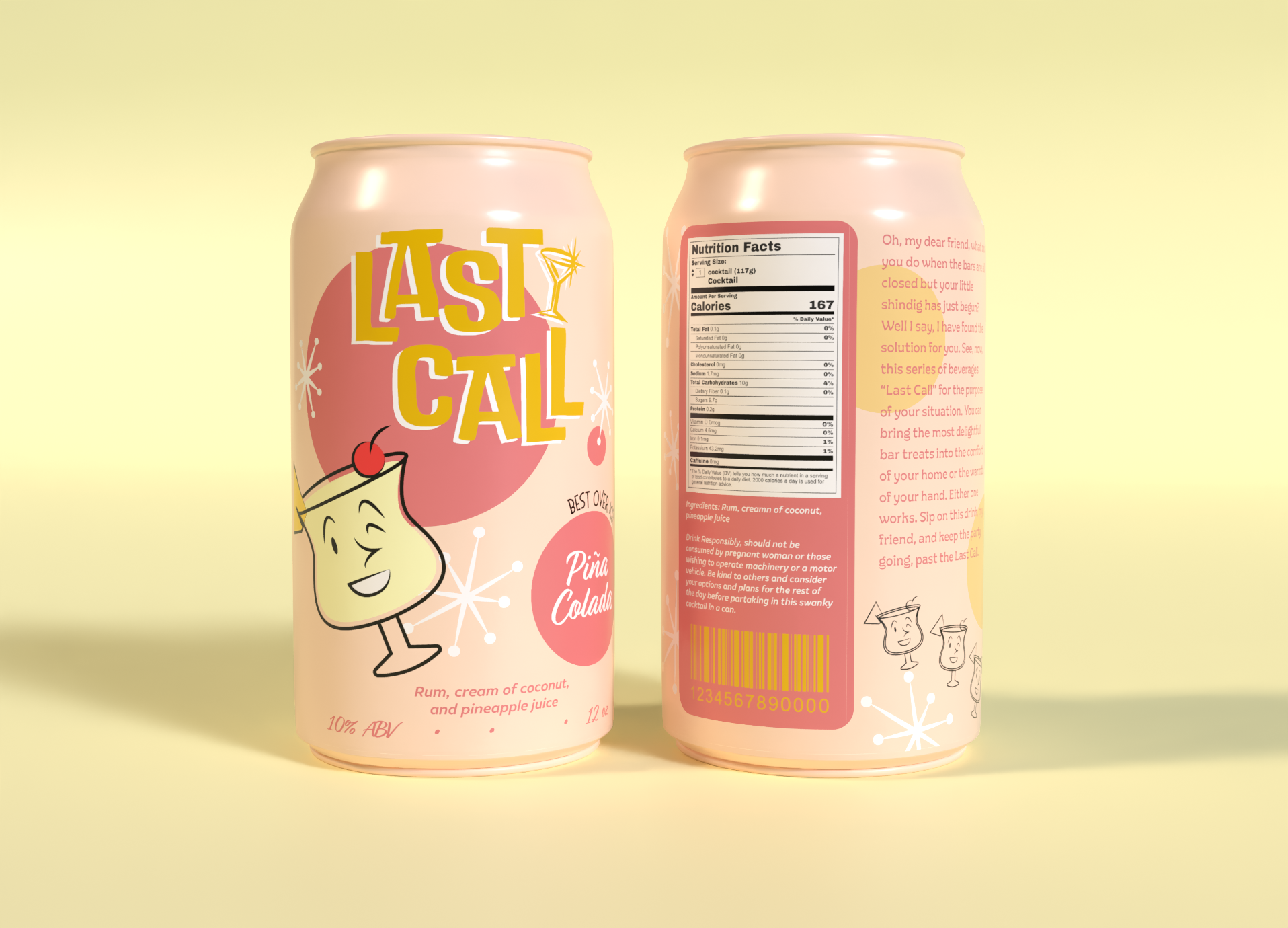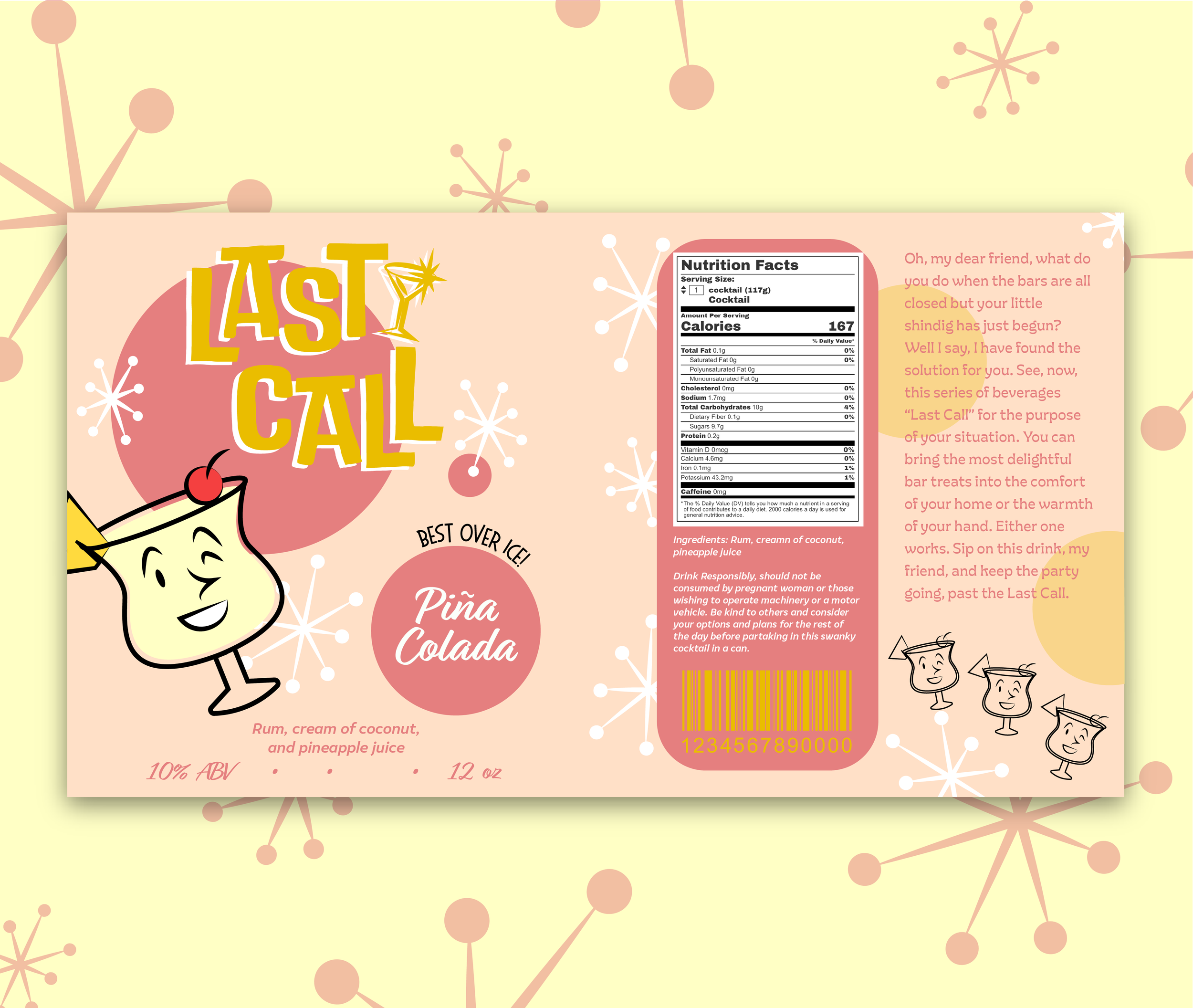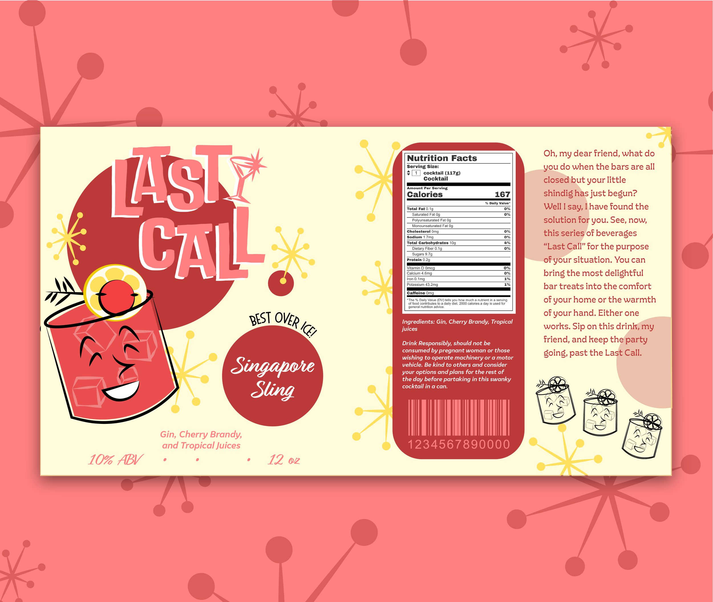Last Call is a series of canned cocktails inspired by the style of Mid century Modern art and mid 20th century tiki and cocktail culture. This six-flavor beverage branding project was created for a packaging design class.