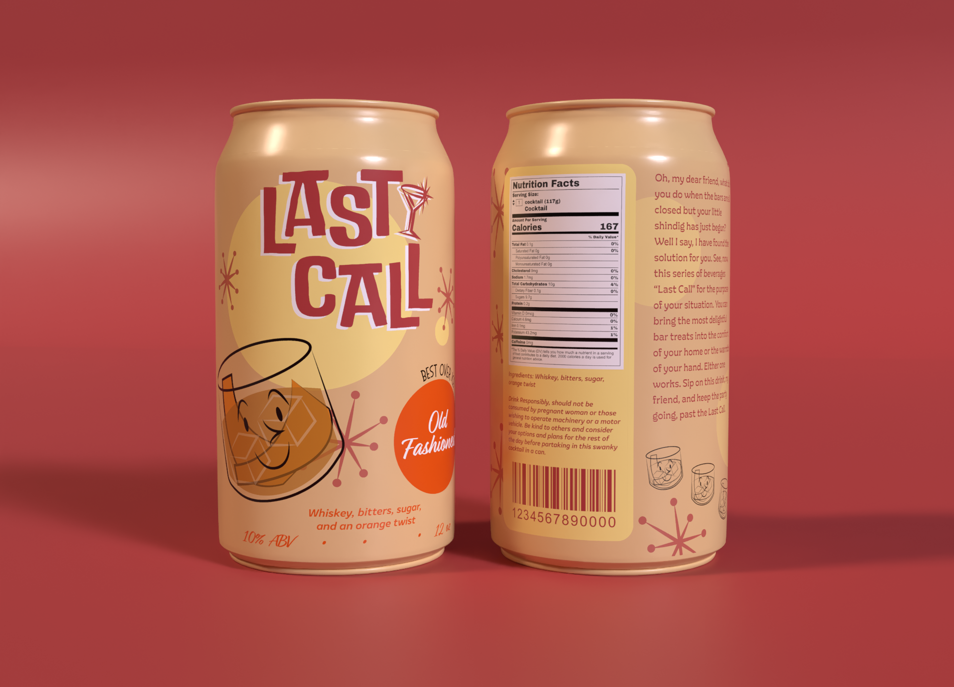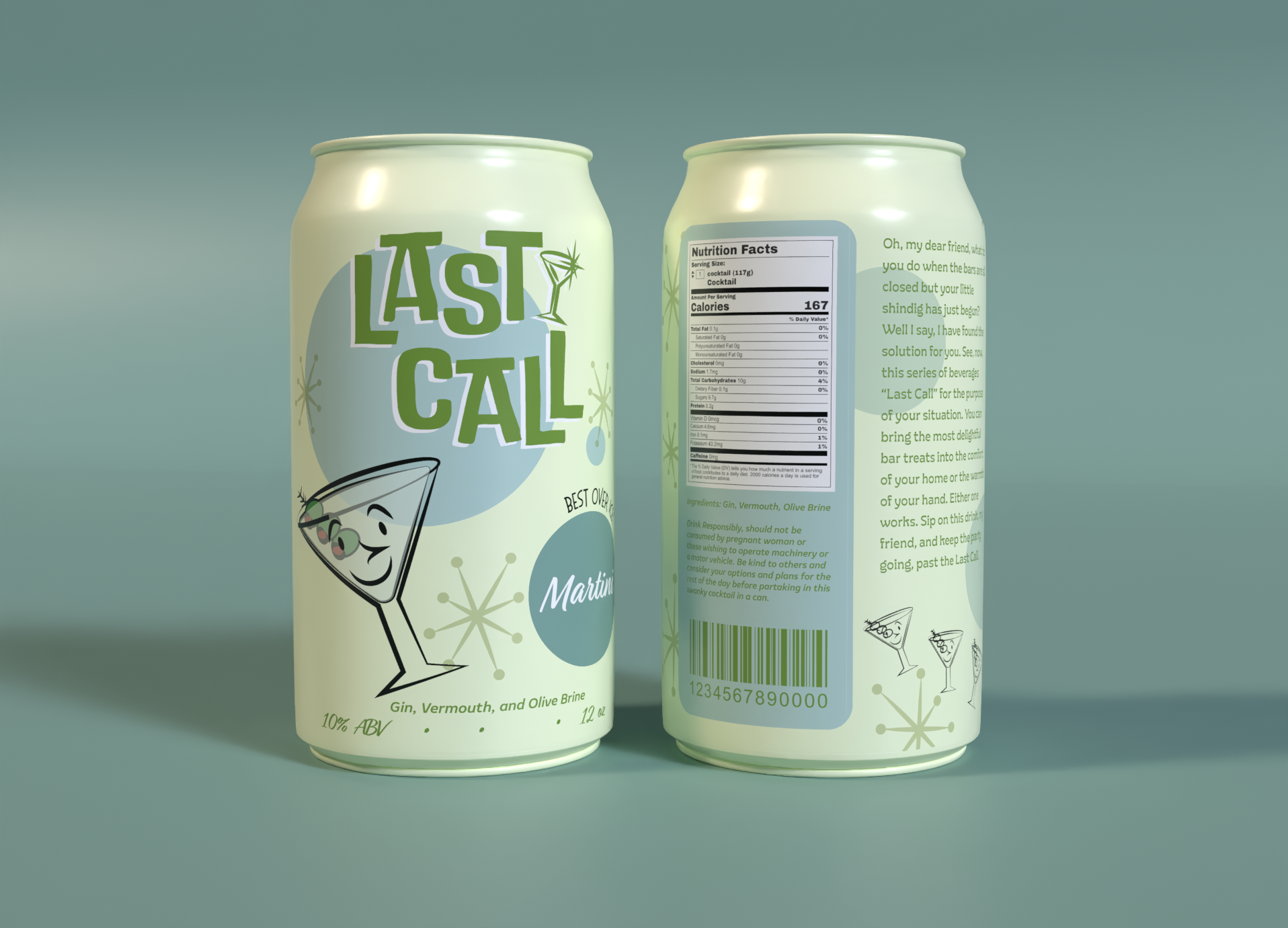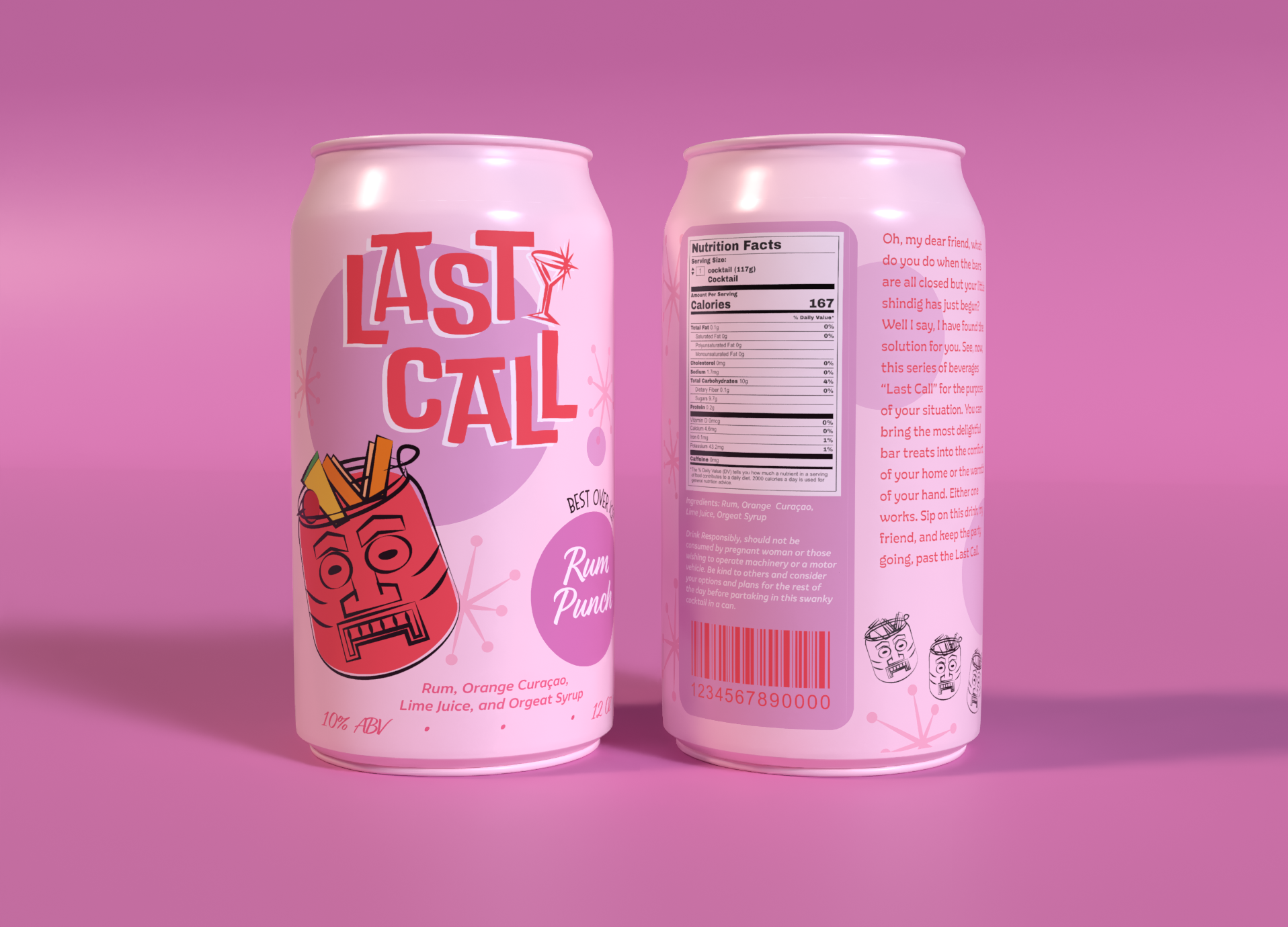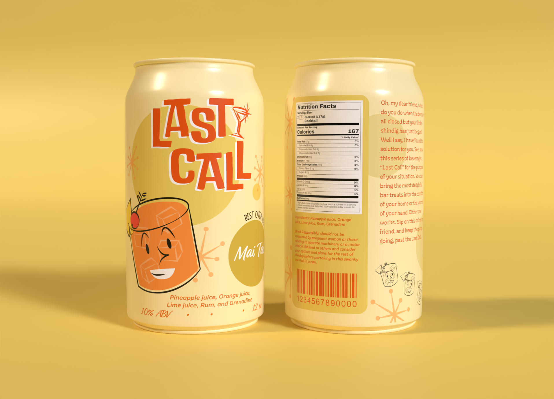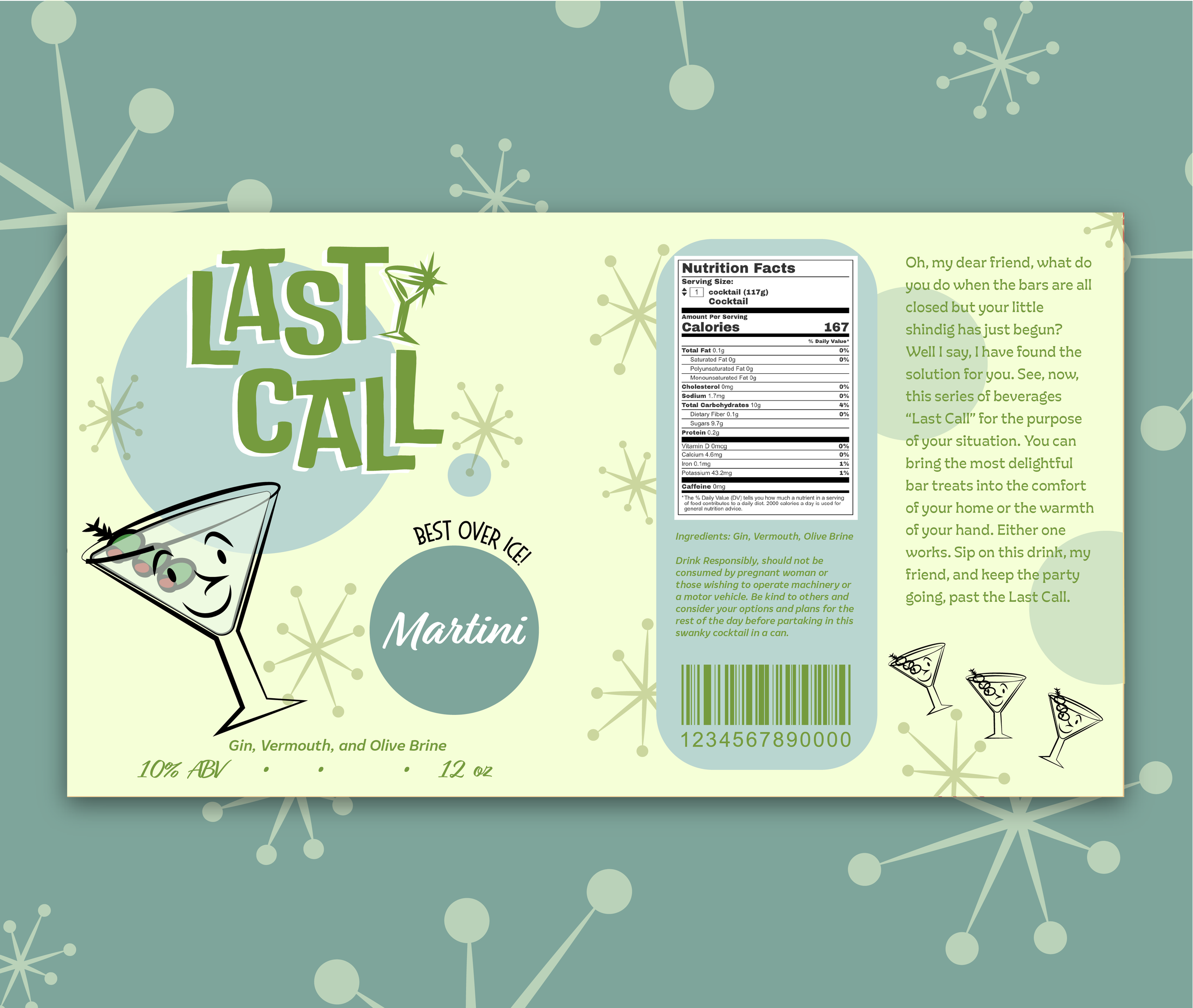 Last Call is a series of canned cocktails inspired by the style of Mid century Modern art and mid 20th century tiki and cocktail culture. This six-flavor beverage branding project was created for a packaging design class.