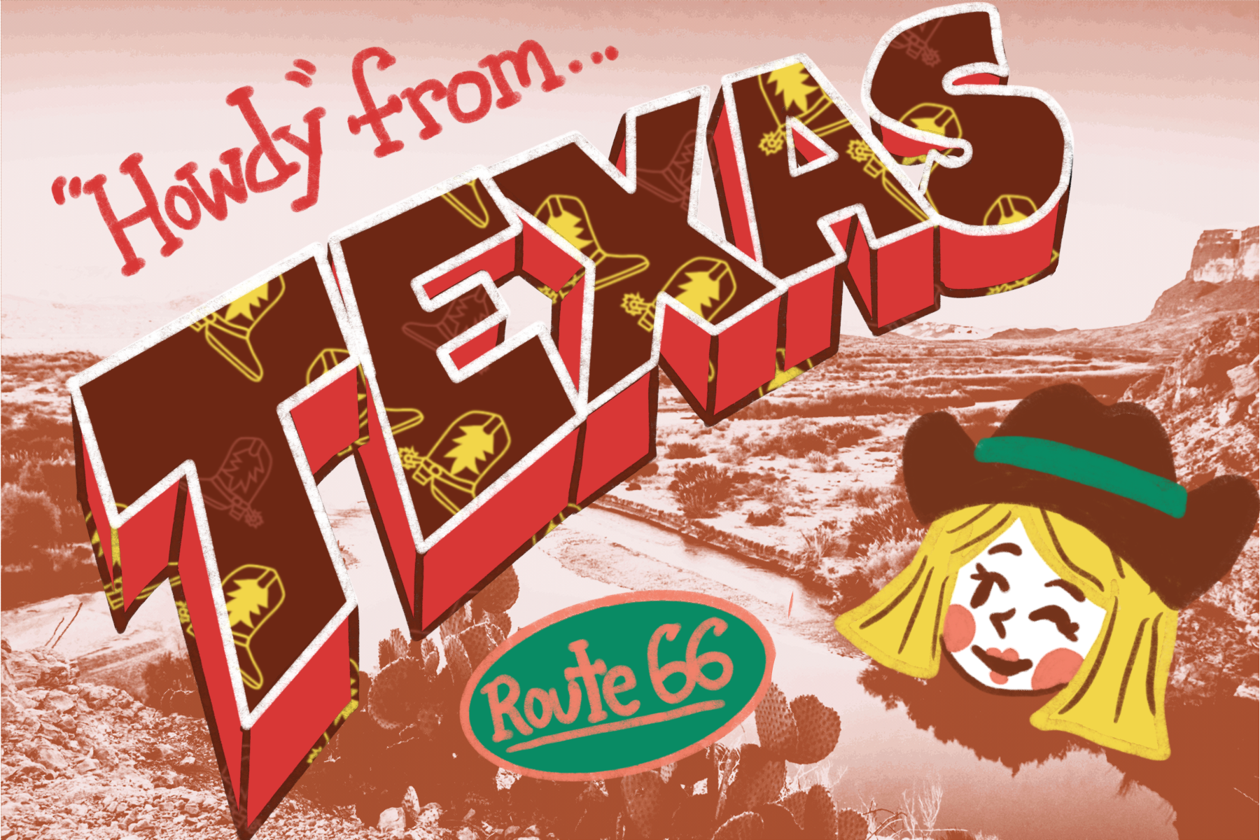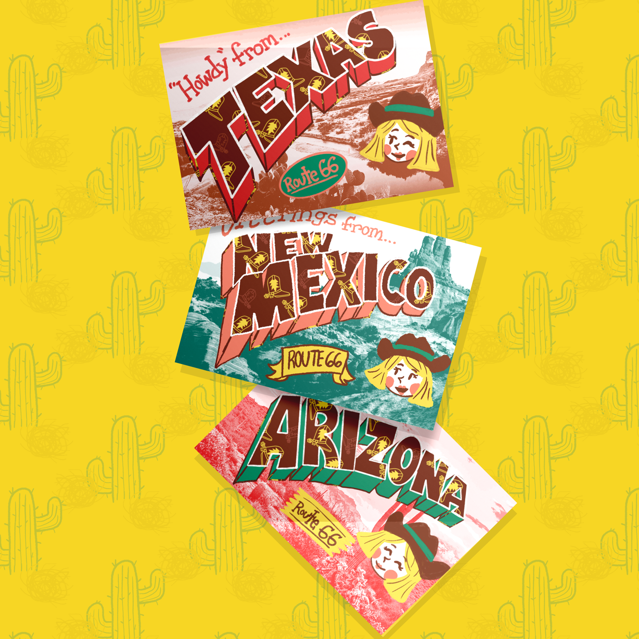 With the nature of a lot of Route 66 attractions being run down over time, I wanted to take a cheeky approach to highlight said attractions with a positive, lively character directing it all. Through my extended research and deep love for Mid-century Modern style, I cut and assembled paper with drawn lines/details on it to create the first logo. I then digitized the paper and cleaned it up, played around with colors, explored texture brushes, and ultimately chose a main font that was similar to the cut paper one I had attempted. I experimented with script fonts early on, but they felt too “on-the-nose" in a Mid-century Modern theme.