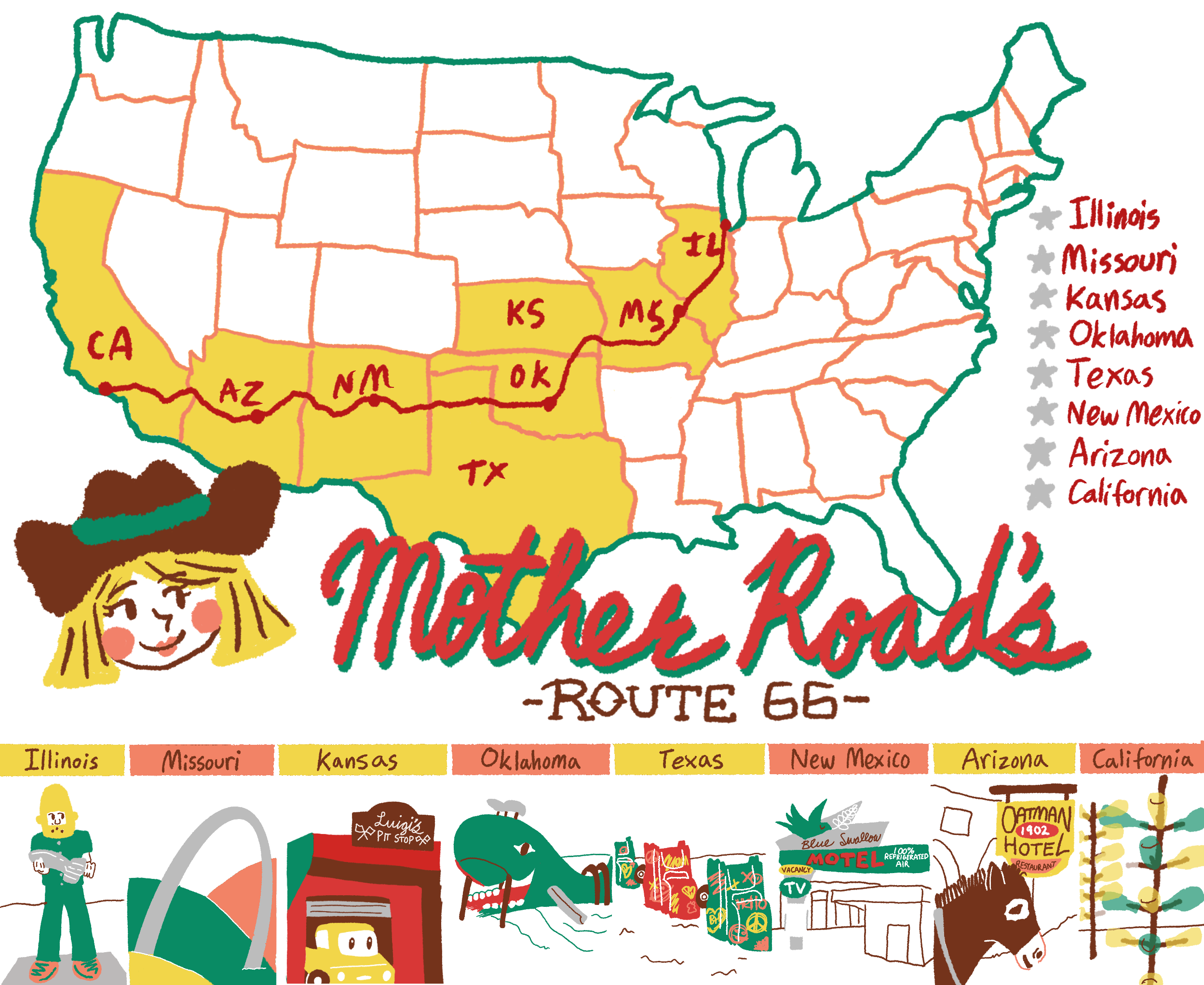 The original name for Route 66 was “Mother Road”, therefore I chose that name as a callback to the history of the great American road trip, and a hallmark to what said route was in its heyday, the mother of all road trips. Initially, the “mother” in my Mother Road logo did not look much like a mother herself. I looked back at books and articles about 1950’s cartoons and determined that adding lipstick to her was the perfect finishing touch.